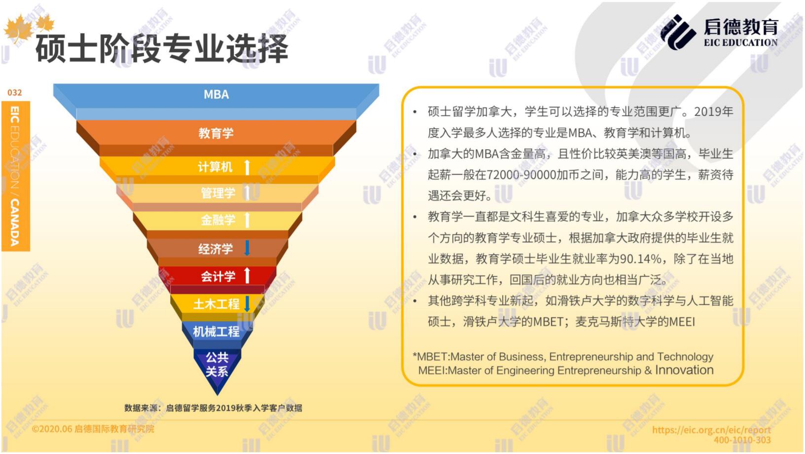 啟德加拿大2019秋季入學(xué)客戶服務(wù)數(shù)據(jù)顯示,在本科階段專業(yè)選擇理工科占比42%,商科占比37.1 %,文科19.1%,理工科的申請(qǐng)人數(shù)超過(guò)了商科。碩士階段選擇最多的專業(yè)是 MBA、教育學(xué)和計(jì)算機(jī),其他新興的跨學(xué)科專業(yè)包括滑鐵盧大學(xué)的數(shù)字科學(xué)與人工智能專業(yè)和商業(yè)、創(chuàng)業(yè)和技術(shù)專業(yè)( MBET ),麥克馬斯特大學(xué)的工程、創(chuàng)業(yè)與創(chuàng)新專業(yè)( MEEI )。