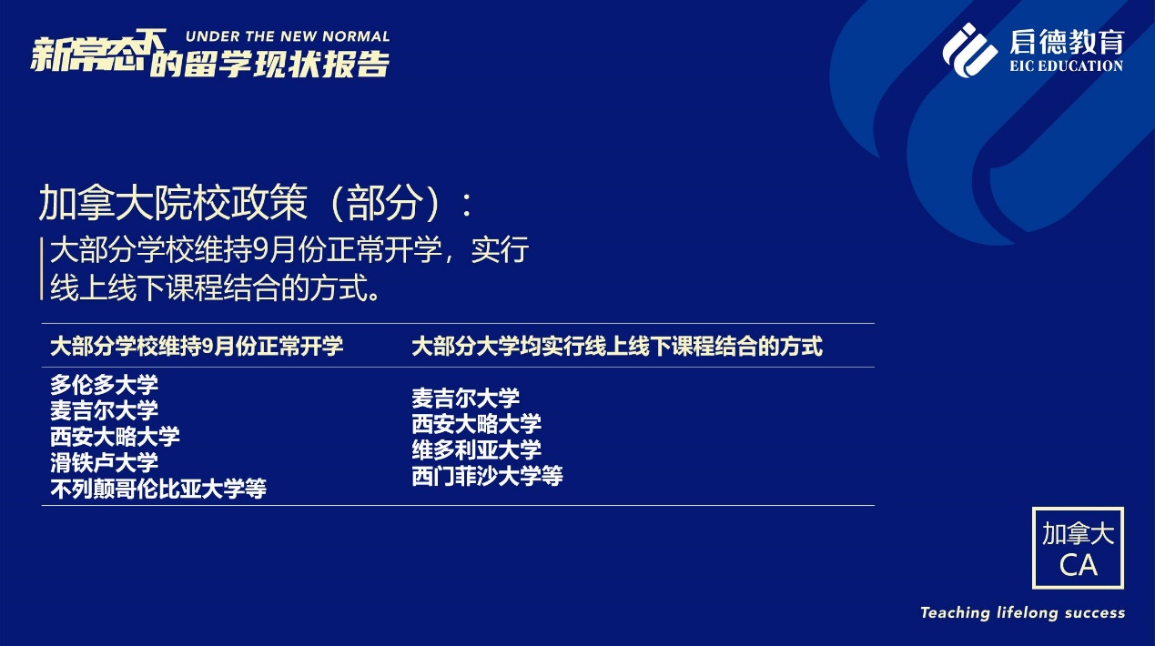 針對(duì)今年秋季入學(xué)的國(guó)際學(xué)生,加拿大多數(shù)院校采取網(wǎng)上授課模式,如多倫多大學(xué)等高校,康尼斯托加等學(xué)院,哥倫比亞國(guó)際學(xué)院( CIC )等中學(xué)都可以接受暫時(shí)無(wú)簽證注冊(cè)網(wǎng)課。部分大學(xué)也將秋季入學(xué)的碩士研究生課程開(kāi)學(xué)時(shí)間順延至2021年春季。