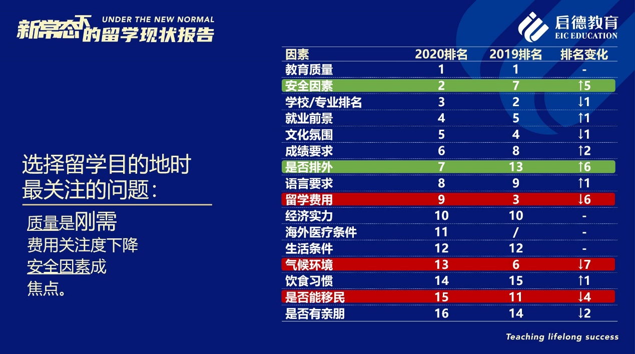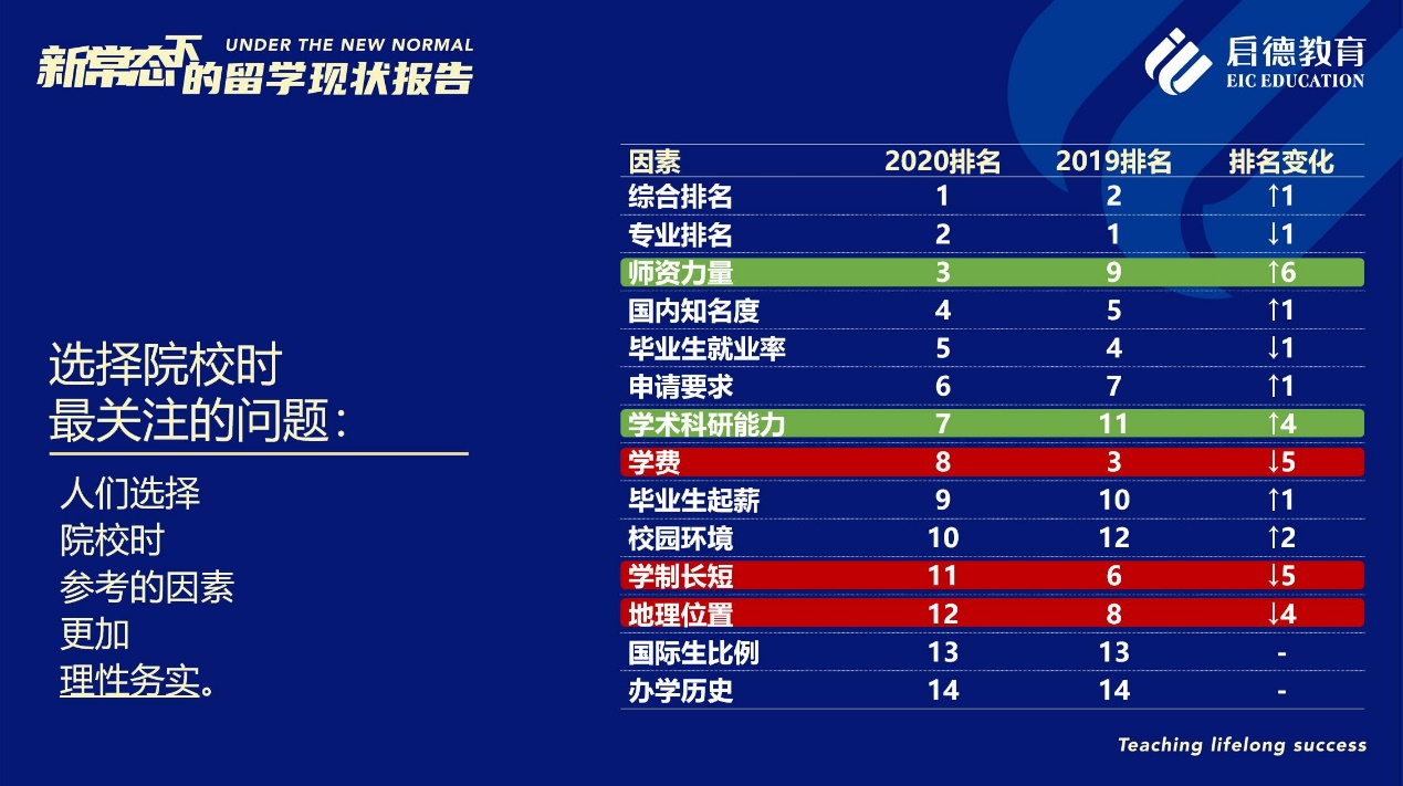 值得關(guān)注的是,在“選擇院校時(shí)最關(guān)注的問(wèn)題”中,“師資力量”的受關(guān)注度從2019年的第9位上升為第3位,僅次于“綜合排名”與“專業(yè)排名”,“國(guó)內(nèi)知名度”與“畢業(yè)生就業(yè)率”分居第4位與第5位,“學(xué)術(shù)科研能力”從2019年的第11位上升至第7位,而“學(xué)費(fèi)”、“學(xué)制長(zhǎng)短”與“地理位置”等因素分別下滑至第8位、第11位與第12位??梢?jiàn)在就業(yè)形勢(shì)尤其嚴(yán)峻的2020年,意向留學(xué)生對(duì)教育質(zhì)量的剛性需求已進(jìn)一步上升,以期在未來(lái)的就業(yè)市場(chǎng)獲得更具戰(zhàn)略優(yōu)勢(shì)的國(guó)際競(jìng)爭(zhēng)力。