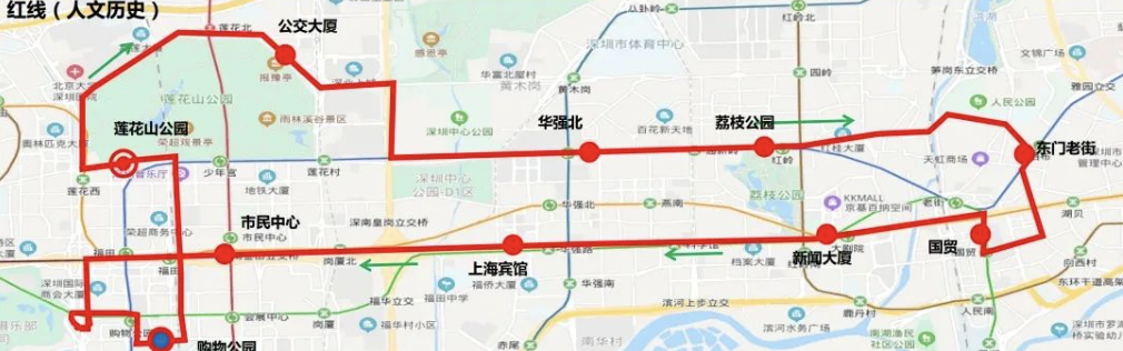 ??空军c(diǎn):蓮花山公交總站→公交大廈→華強(qiáng)北→荔枝公園→東門老街→國(guó)貿(mào)→新聞大廈→上海賓館→市民中心→購(gòu)物公園地鐵站→蓮花山公園→蓮花山公交總站