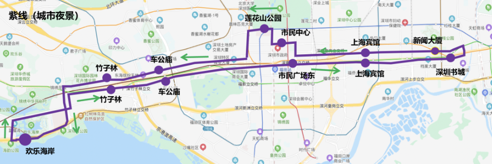 ??空军c(diǎn):歡樂海岸→竹子林→車公廟→市民廣場(chǎng)東→上海賓館→深圳書城→新聞大廈→上海賓館→市民中心→蓮花山公園→車公廟→歡樂海岸