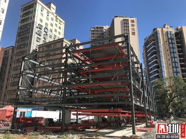正在施工的羊臺(tái)新村機(jī)械立體車(chē)庫(kù)。
