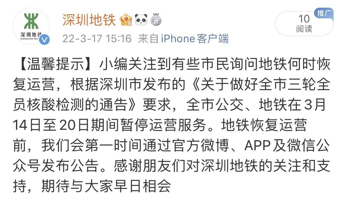 對此,記者向深圳地鐵求證,深圳地鐵表示,根據(jù)深圳市發(fā)布的《關于做好全市三輪全員核酸檢測的通告》要求,全市公交、地鐵在3月14日至20日期間暫停運營服務。地鐵恢復運營前,深圳地鐵會第一時間通過官方微博、APP及微信公眾號發(fā)布公告。