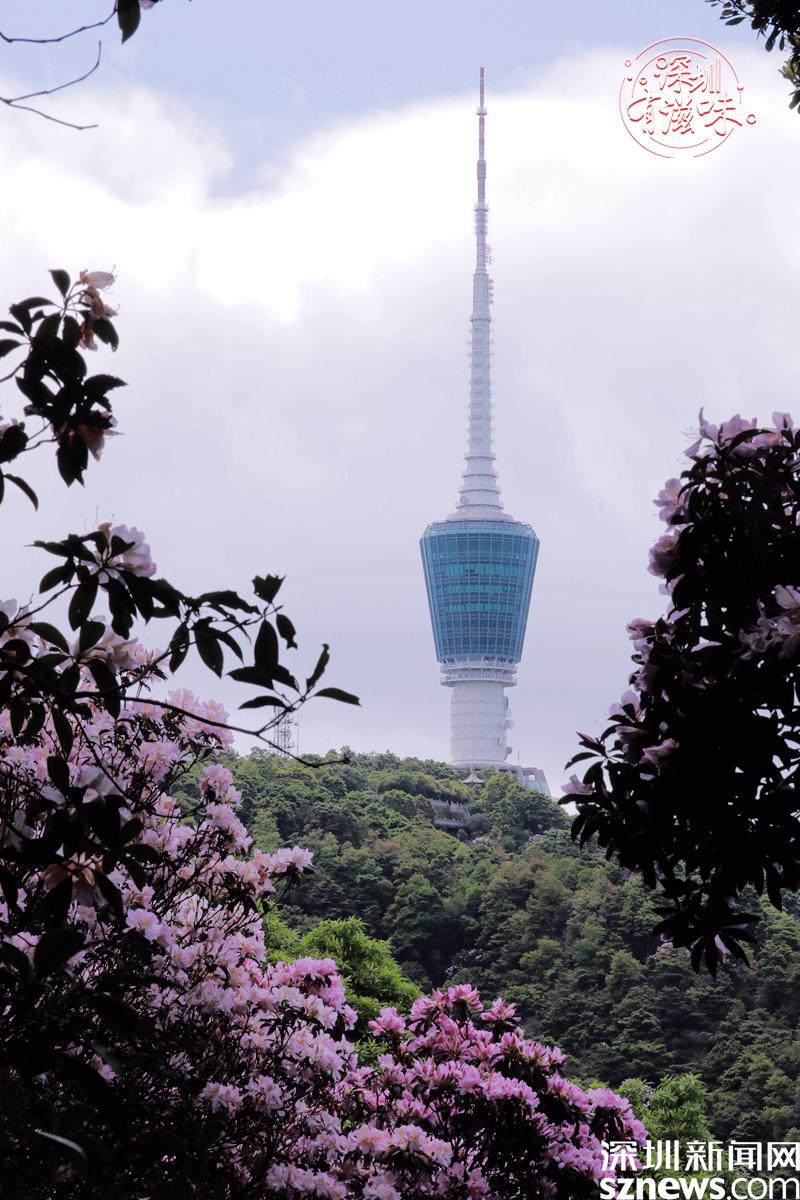 前往萬(wàn)花屏的路上,可以拍到電視塔與綻放的毛棉杜鵑花形成的絕美同框畫。