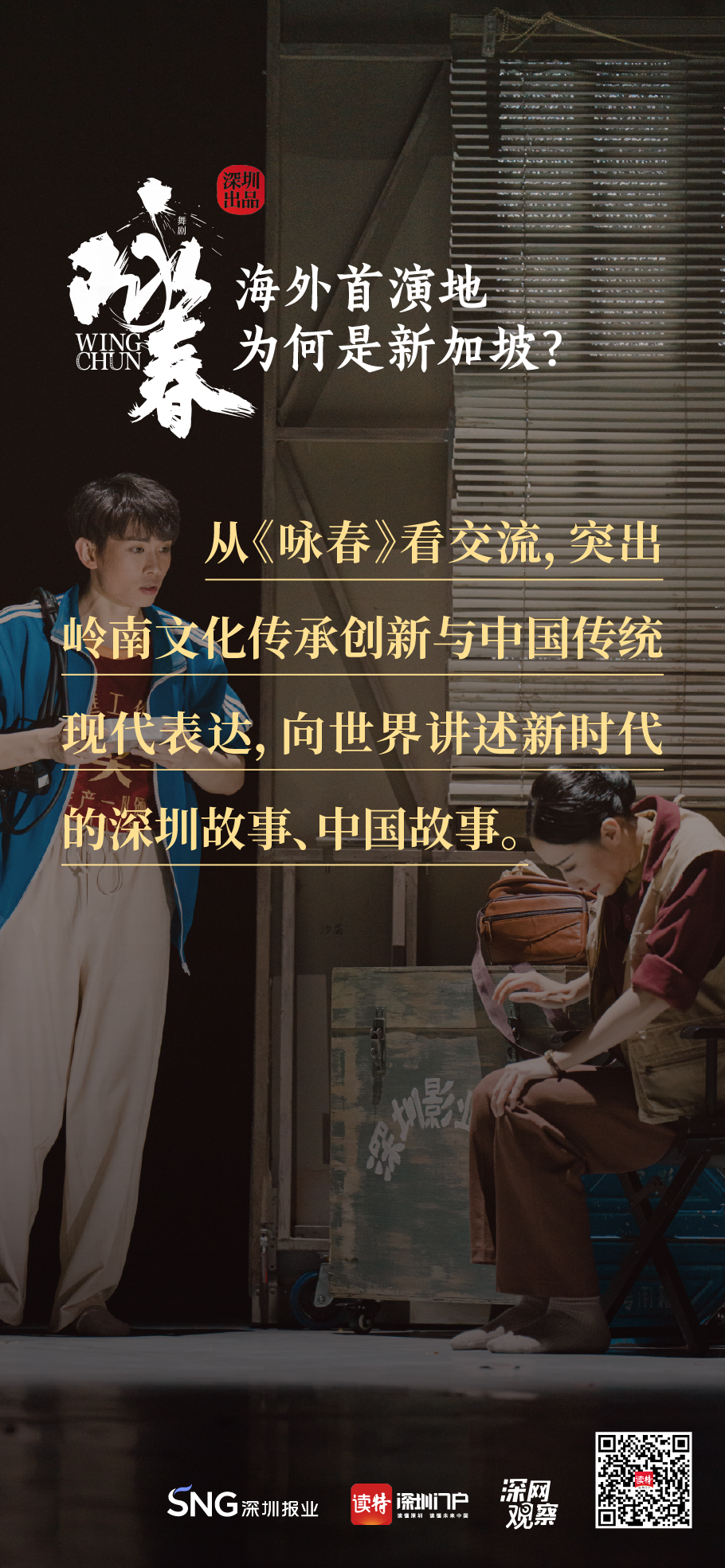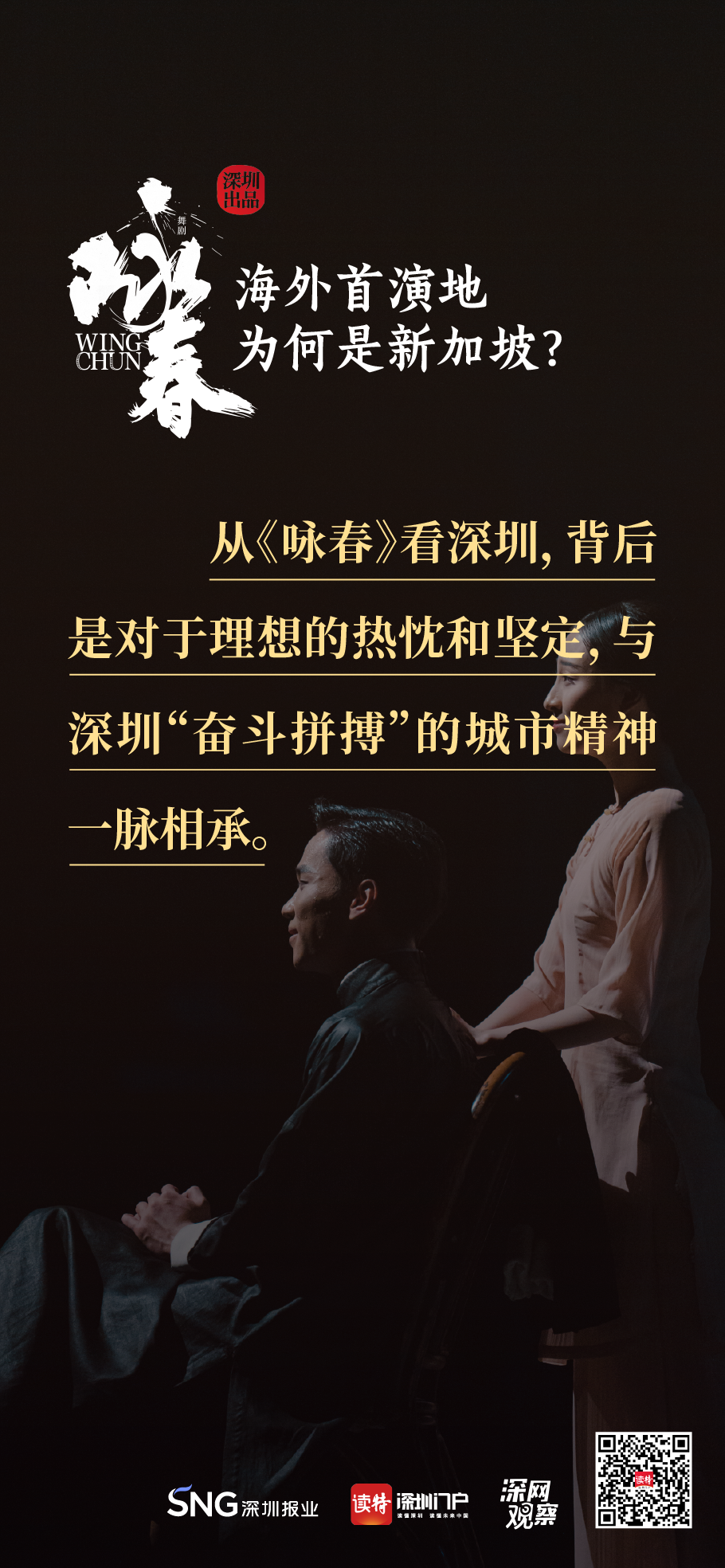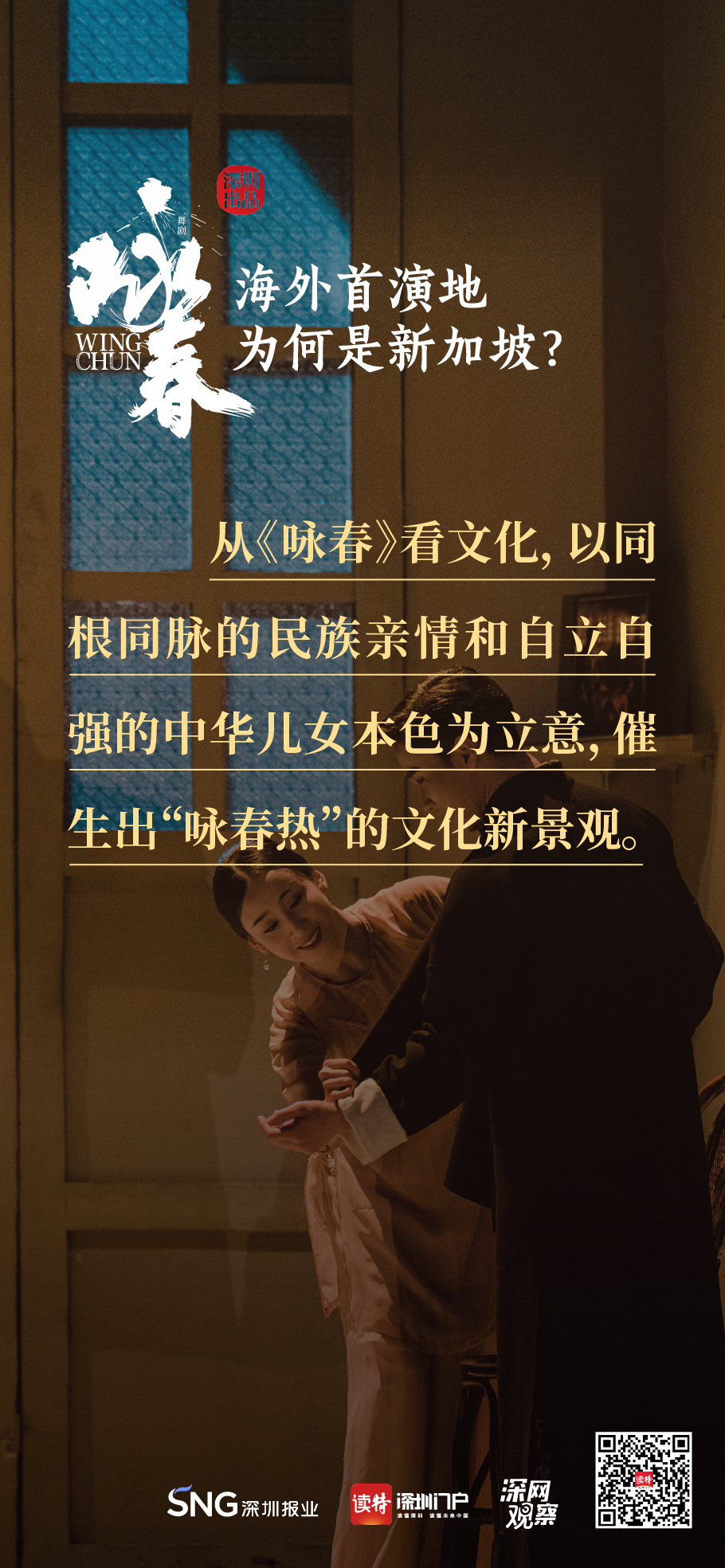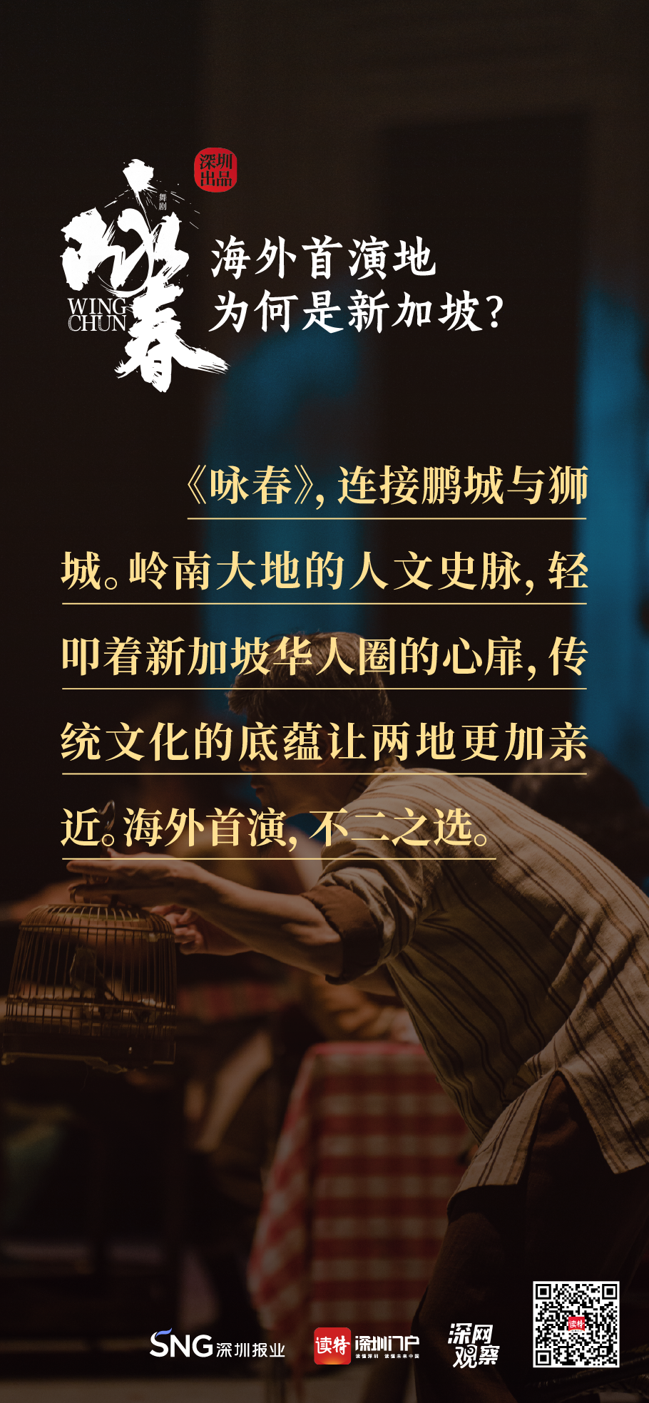 《詠春》書(shū)寫(xiě)平凡英雄的傳奇,開(kāi)詠春的一扇門(mén),只為追尋心中的那一束光。《詠春》,連接鵬城與獅城,嶺南大地的人文史脈,輕叩著新加坡華人圈的心扉,傳統(tǒng)文化的底蘊(yùn)讓兩地更加親近,海外首演,不二之選。