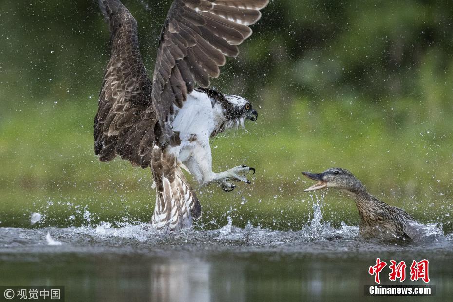 2018年6月21日訊(具體拍攝時(shí)間不詳),英國(guó)蘇格蘭高地,一只憤怒的綠頭鴨襲擊一只捕食的魚(yú)鷹。攝影師Andy Howard對(duì)于當(dāng)時(shí)眼前的景象感到十分震驚,并用鏡頭記錄下來(lái)了整個(gè)打斗過(guò)程。母鴨最后跳到魚(yú)鷹背上,害得魚(yú)鷹不得不丟下到手的鱒魚(yú)落荒而逃。他表示,沒(méi)有發(fā)現(xiàn)任何明顯的原因會(huì)引發(fā)這場(chǎng)打斗,母鴨并沒(méi)有幼崽需要保護(hù),而魚(yú)鷹也不吃鴨子?!盀榱粟s在晨光出現(xiàn)時(shí)拍照片,我必須凌晨2點(diǎn)鐘就起床,但我當(dāng)時(shí)并不知道有這么精彩的一出戲在等著我?!?圖片來(lái)源:視覺(jué)中國(guó)