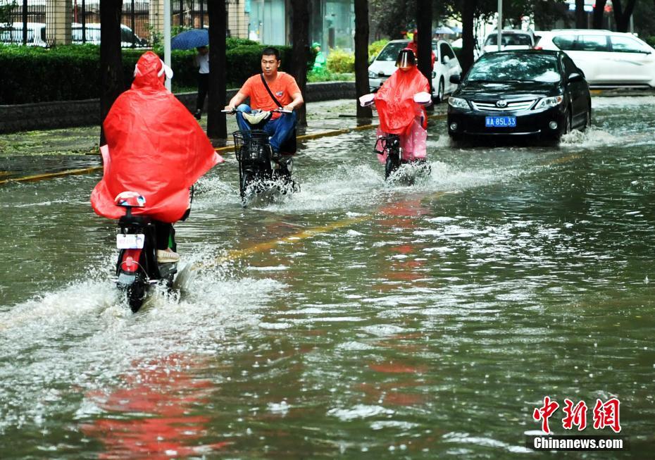 河北石家莊遭遇暴雨 道路積水民眾涉水出行