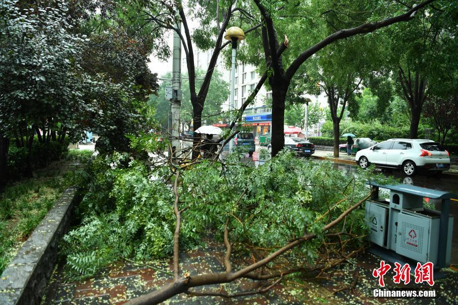 7月16日下午,河北石家莊街頭,樹枝被暴風(fēng)雨折斷。當(dāng)日,該省氣象臺(tái)發(fā)布暴雨藍(lán)色預(yù)警,承德、雄安新區(qū)、廊坊北部、石家莊中西部、邢臺(tái)西部等多地遭受暴雨襲擊。中新社記者翟羽佳 攝