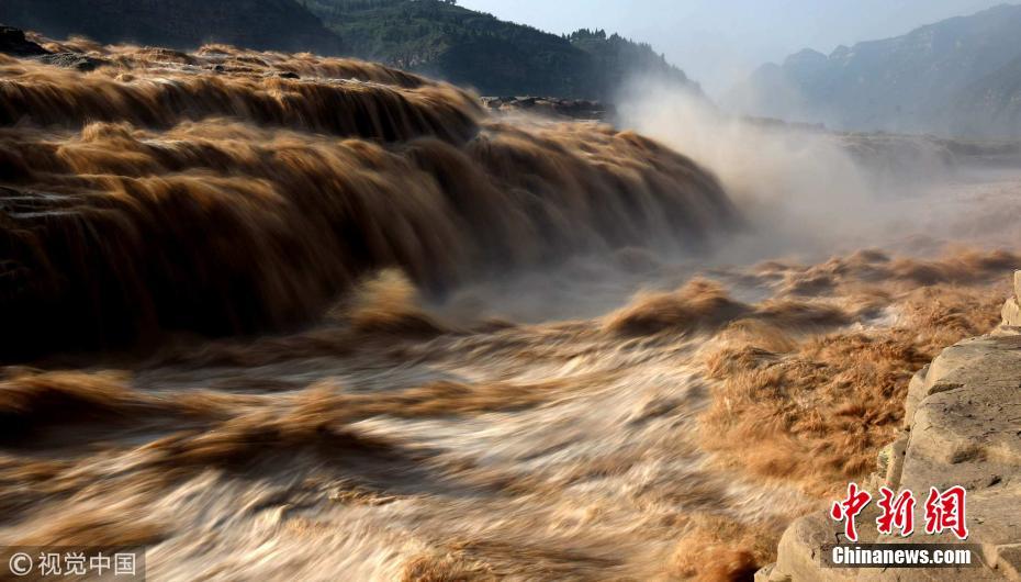 7月17日,山西臨汾,游客在黃河壺口瀑布游覽觀瀑。進(jìn)入7月主汛期,受黃河上游降雨量增多影響,位于山西吉縣和陜西宜川縣交界的黃河壺口瀑布水量暴漲。濁浪滔天的壯美瀑布群景觀,吸引了眾多游客。呂桂明攝 圖片來源:視覺中國