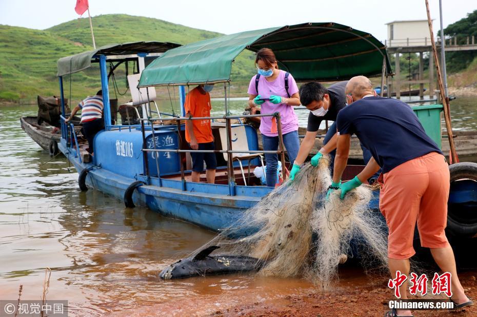 8月1日早晨,濂溪區(qū)護(hù)豚隊(duì)接到漁民打來的電話,在湖口縣鄱陽湖的屏峰水域,發(fā)現(xiàn)水中絲網(wǎng)里有一頭江豚,懷疑已死亡。接到電話后,正在芳蘭湖清理水中定制網(wǎng)的濂溪區(qū)護(hù)豚隊(duì)隨即趕到現(xiàn)場(chǎng)。護(hù)豚隊(duì)隊(duì)員趕到現(xiàn)場(chǎng)時(shí)看到,事發(fā)地點(diǎn)距離岸邊約30米,一頭大江豚全身被水中的絲網(wǎng)纏住,無法動(dòng)彈。見此情況,大家將渾身纏滿絲網(wǎng)的江豚連網(wǎng)一起運(yùn)至岸邊,同時(shí)與中科院武漢水生生物所取得聯(lián)系。洪永林 攝 圖片來源:視覺中國 文字來源:九江新聞網(wǎng)