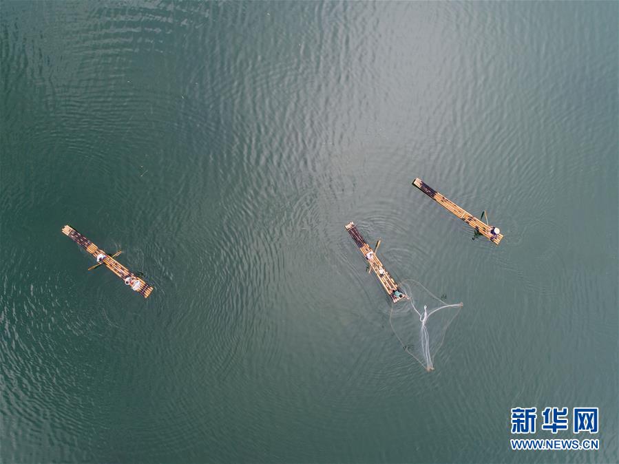 8月1日,淳安縣汾口鎮(zhèn)紅星村的漁民乘著竹排,在千島湖的支流武強溪上進行撒網(wǎng)捕撈作業(yè)(無人機拍攝)。新華社記者 徐昱攝