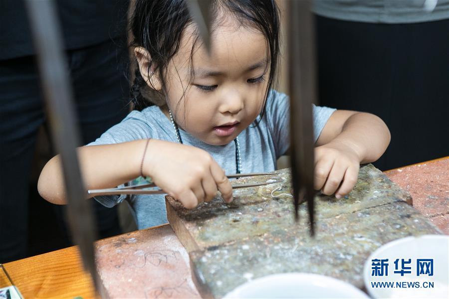 8月3日,來自西安的小朋友月白在龍?zhí)栥y飾體驗工作室中學(xué)習(xí)制作銀飾。