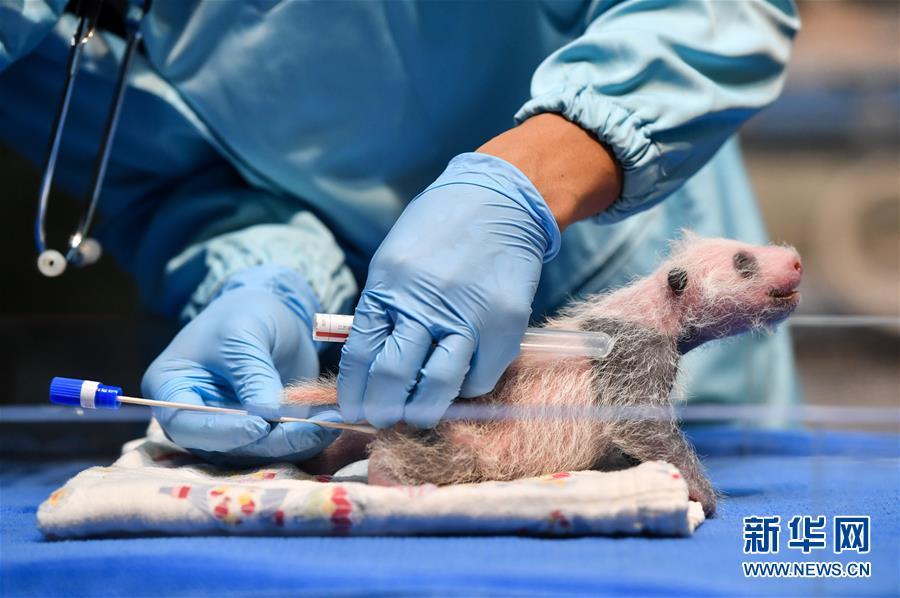 8月12日,中國大熊貓保護研究中心專家在廣州長隆野生動物世界華南大熊貓繁育基地為新生大熊貓“婷仔”提取肛門分泌物以進行檢測。新華社記者 劉大偉 攝