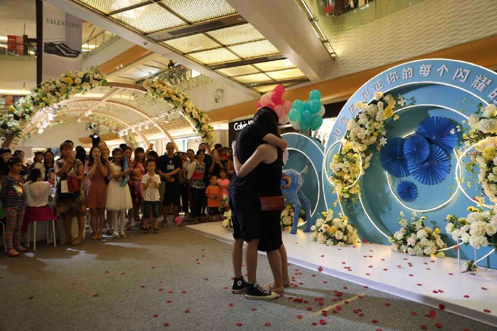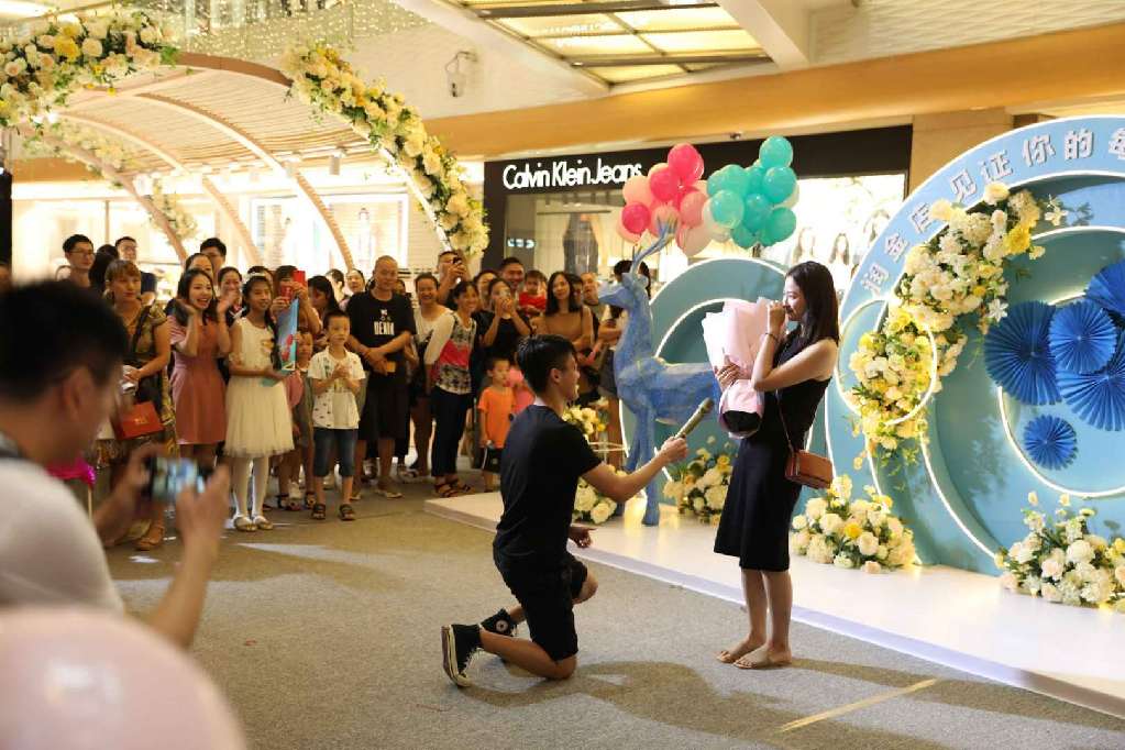開幕式當(dāng)天,潤金店工作人員還配合市民楊先生上演了一場浪漫的“求婚大作戰(zhàn)”。原來,數(shù)日前,楊先生到潤金店表示要買一枚與眾不同的戒指向女友求婚。在銷售顧問的建議下,楊先生選購了一枚藍(lán)寶石戒指作為求婚信物。得知楊先生的心意后,潤金店品牌策劃部決定與楊先一起在七夕當(dāng)天完成這場浪漫的“求婚大作戰(zhàn)”。當(dāng)天,楊先生帶著毫不知情的女友來到潤金店“炫出色彩 耀你不凡”VIP品鑒會現(xiàn)場。正當(dāng)女友全神貫注欣賞小提琴、拉丁舞等開幕式表演節(jié)目時,楊先生從兜里掏出事先準(zhǔn)備好的藍(lán)寶石戒指,單膝跪地向一臉茫然的女友喊:“嫁給我吧?!贝藭r,開幕式現(xiàn)場背景音樂“配合”地?fù)Q成了甜蜜的《今天你要嫁給我》。感動得熱淚盈眶的女友在圍觀市民的歡呼中,拉起了楊先生,并答應(yīng)了他的求婚。圍觀市民表示“七夕不過是路過,卻不料狠狠地吃了一把狗糧。”