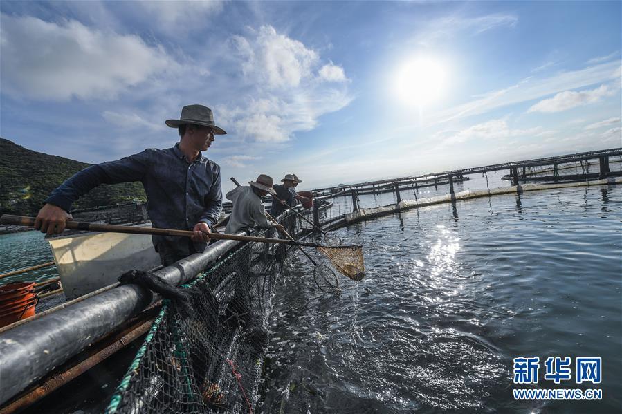 8月18日,南麂島海域的“海上牧場(chǎng)”養(yǎng)殖區(qū)內(nèi),漁民正捕撈大黃魚(yú),處于仿生養(yǎng)殖環(huán)境的大黃魚(yú)需要生長(zhǎng)2至3年。進(jìn)入8月,浙江省溫州市平陽(yáng)縣南麂鎮(zhèn)海域上大片的大黃魚(yú)、貽貝等特色海產(chǎn)品養(yǎng)殖區(qū)域迎來(lái)豐收季節(jié),養(yǎng)殖戶們駕駛漁船在養(yǎng)殖區(qū)海域進(jìn)行打撈收獲,在碧海藍(lán)天下構(gòu)成了一幅“海上牧場(chǎng)”的美麗豐收景象。近年來(lái),南麂鎮(zhèn)政府引導(dǎo)漁民養(yǎng)殖戶充分發(fā)揮“靠海吃海”的資源優(yōu)勢(shì),大力發(fā)展海洋養(yǎng)殖經(jīng)濟(jì)和海島旅游經(jīng)濟(jì),實(shí)現(xiàn)了南麂由“生態(tài)美”向“產(chǎn)業(yè)美”,“產(chǎn)業(yè)美”向“經(jīng)濟(jì)美”的轉(zhuǎn)變。同時(shí)該鎮(zhèn)堅(jiān)持以大黃魚(yú)、貽貝等為特色產(chǎn)業(yè)支撐,精準(zhǔn)發(fā)展高效海洋養(yǎng)殖業(yè),重點(diǎn)培養(yǎng)一批新型職業(yè)漁民,依靠專業(yè)技術(shù)支持,實(shí)現(xiàn)深海仿生養(yǎng)殖,讓好生態(tài)造就好品質(zhì),重點(diǎn)打造南麂養(yǎng)殖品牌,組建營(yíng)銷網(wǎng)絡(luò),拓展特色海產(chǎn)品市場(chǎng)。新華社記者 徐昱攝