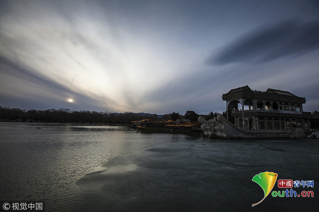2018年2月23日,北京頤和園。當(dāng)天日落時(shí)分昆明湖上空出現(xiàn)夕陽(yáng)余暉的美景,夢(mèng)幻般的色彩將古老的皇家園林裝扮得美輪美奐,讓人流連忘返。來(lái)源:視覺(jué)中國(guó)