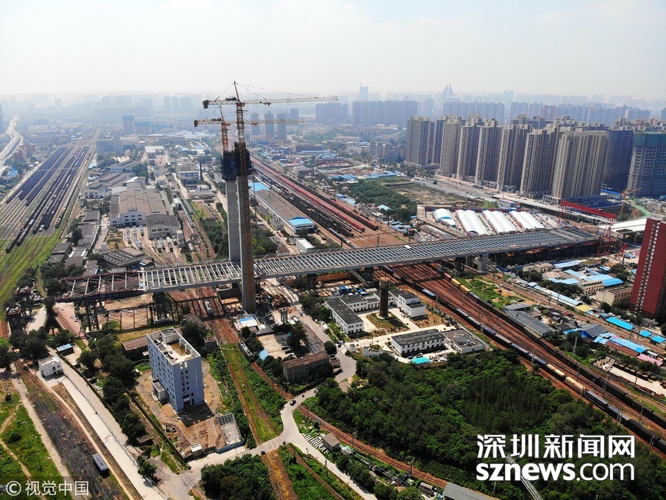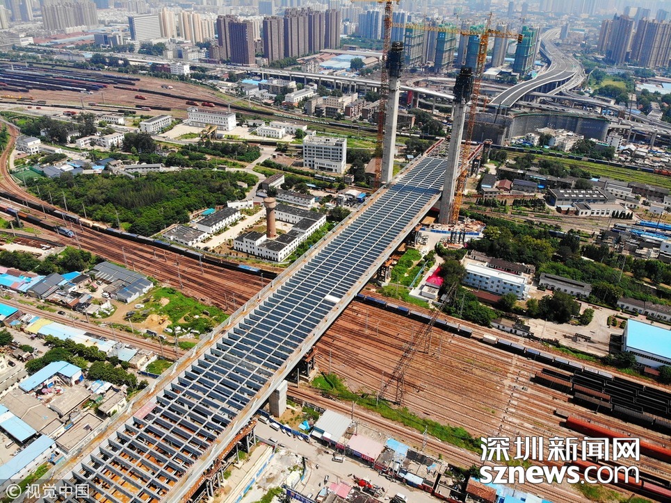 深圳新聞網訊 2018年8月19日,鄭州,跨亞洲最大火車站編組站的農業(yè)路高架鄭北大橋工程開始最后一輪頂推,長度為160米,約占總頂推長度的1/3,頂推重量達到9000噸。