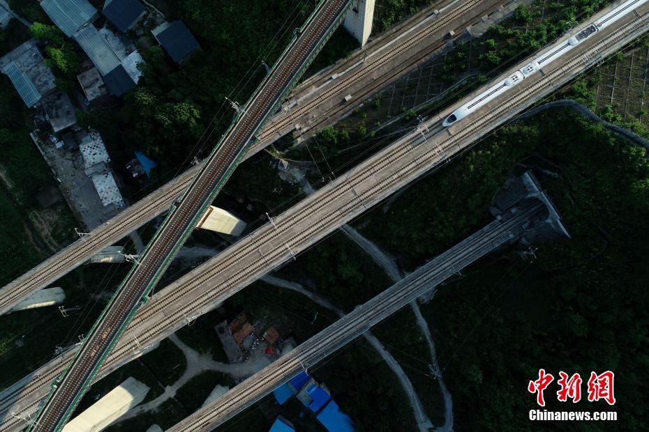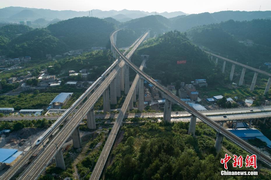 5月16日,航拍貴陽市郊交織的五條高鐵線路,一列動車駛出隧道。貴州省地處中國西南腹地,高原山地居多,因此高鐵建設的橋隧占比較高。在貴陽市烏當區(qū)新添寨,高鐵滬昆線、貴廣客運專線、貴開城際客運專線的隧道和橋梁交織在一起,形成“五洞五橋”并行。中新社記者賀俊怡 攝 5月16日,一列動車從貴陽市郊交織的橋梁上駛過。貴州省地處中國西南腹地,高原山地居多,因此高鐵建設的橋隧占比較高。在貴陽市烏當區(qū)新添寨,高鐵滬昆線、貴廣客運專線、貴開城際客運專線的隧道和橋梁交織在一起,形成“五洞五橋”并行。中新社記者賀俊怡 攝