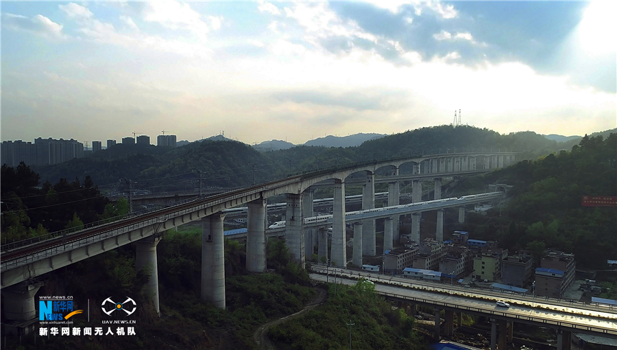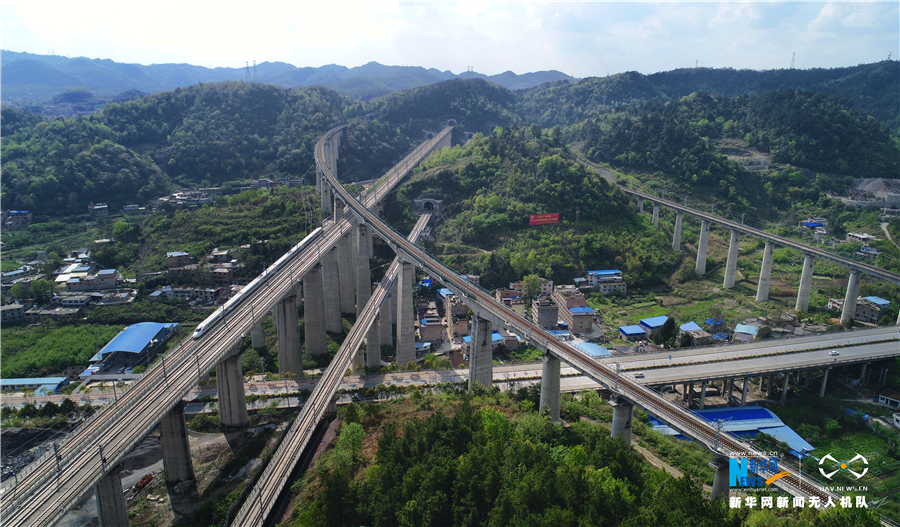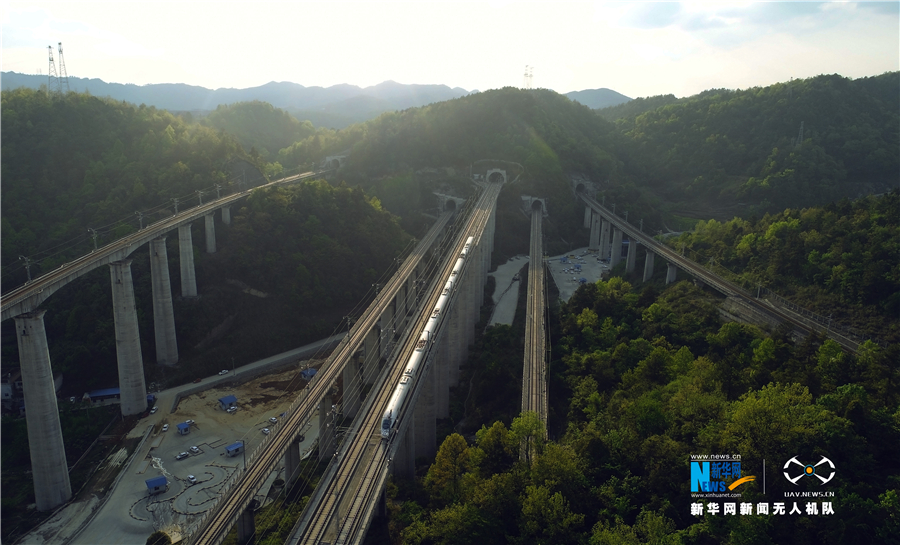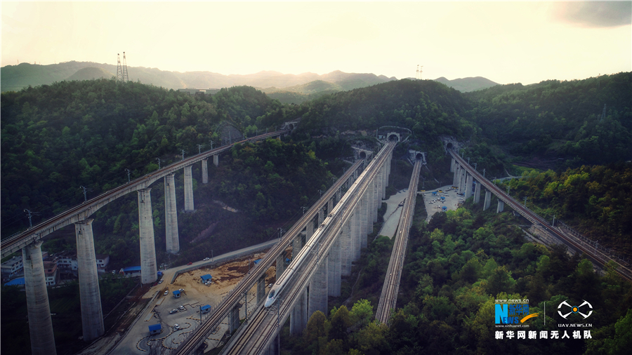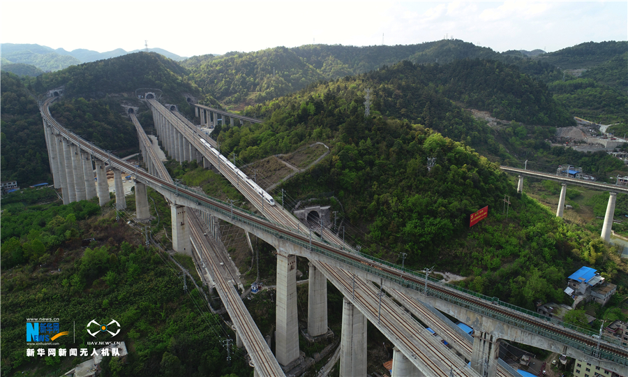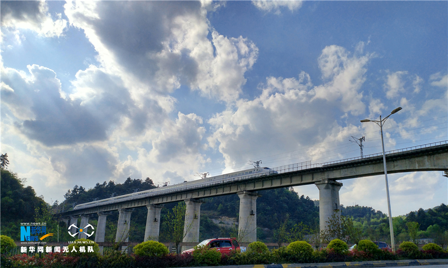 貴州省地處中國西南腹地,全省高原山地居多,因此高鐵建設的橋隧占比較高。在貴陽市烏當區(qū)新添寨,高鐵滬昆線、貴廣客運專線、貴開城際客運專線的隧道和橋梁交織在一起,形成“五洞五橋”并行,形似“五龍出海”的壯觀景象。圖為3月29日,一輛動車在高鐵線路上運行。新華網周遠鋼 攝 |