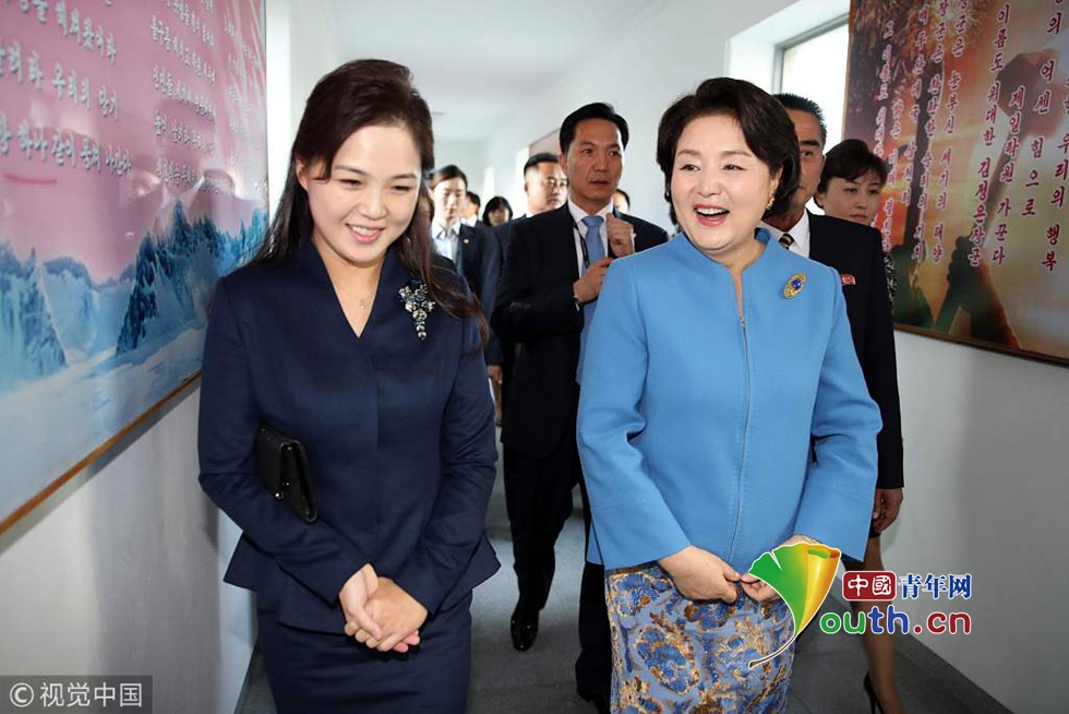 當(dāng)?shù)貢r間2018年9月18日,朝鮮平壤,韓國總統(tǒng)文在寅夫人金正淑在朝鮮國務(wù)委員會委員長金正恩夫人李雪主的陪同下參觀平壤金元均音樂大學(xué)。圖片作者:視覺中國