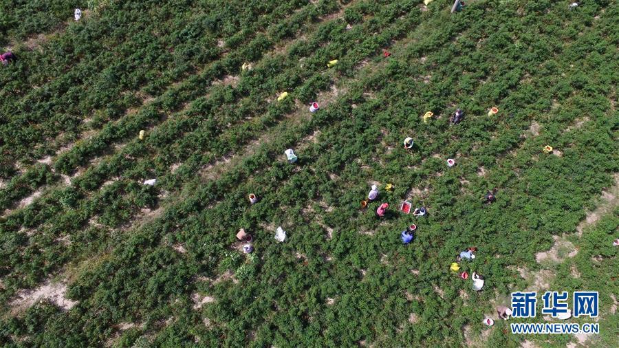 9月16日,阜城縣王集鄉(xiāng)南張莊村農(nóng)民在采摘辣椒(無人機拍攝)。近年來,河北省阜城縣王集鄉(xiāng)在推進產(chǎn)業(yè)富民過程中,積極引導(dǎo)農(nóng)民調(diào)整農(nóng)業(yè)產(chǎn)業(yè)結(jié)構(gòu),按照品種特色化、種植規(guī)模化、產(chǎn)銷一體化的“公司+基地+農(nóng)戶”的經(jīng)營模式,鼓勵農(nóng)民發(fā)展特色辣椒種植,推行“訂單種植”模式,開辟出了一條農(nóng)民創(chuàng)收新路徑。目前,阜城縣王集鄉(xiāng)辣椒種植面積3100余畝,每畝年收益2500元以上,帶動當(dāng)?shù)剞r(nóng)民實現(xiàn)增收。新華社記者朱旭東攝