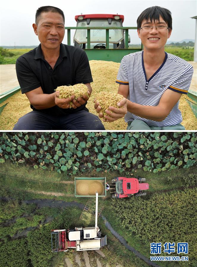 這張拼版照片顯示的是:上圖,9月21日,在江西省南昌市新建區(qū)留田村,種糧大戶周小林(左)、周標(biāo)父子展示收獲的稻谷;下圖,9月21日,周小林、周標(biāo)父子操作農(nóng)機(jī)收割中稻,同時將稻谷裝入拖拉機(jī)(無人機(jī)拍攝)。 新華社記者彭昭之?dāng)z