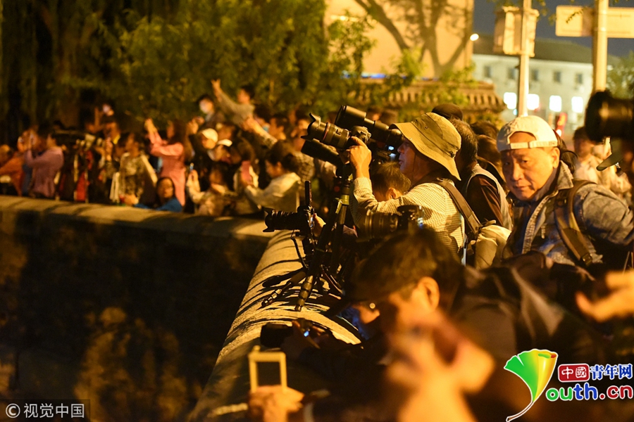 許多市民和攝影愛好者聚集故宮角樓下拍攝月亮。圖片作者/視覺中國(guó)