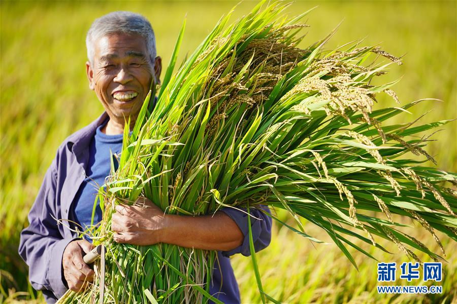 9月23日,河北省灤縣茨榆坨鎮(zhèn)西長(zhǎng)坨村農(nóng)民金玉柱在收獲稻米。