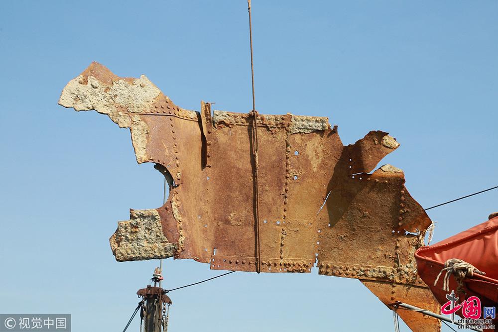 2018年9月25日,遼寧大連,考古工作人員把一片“經(jīng)遠(yuǎn)艦”裝甲進行吊裝轉(zhuǎn)運。視覺中國