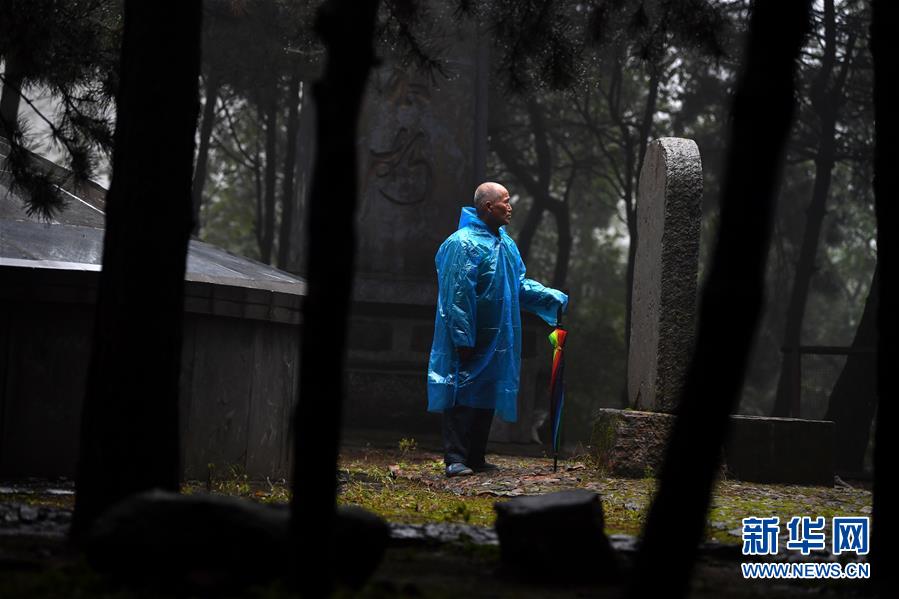 趙乃堂在黃崖洞烈士陵園烈士墓碑前肅立瞻仰(9月18日攝)。 新華社記者 詹彥 攝