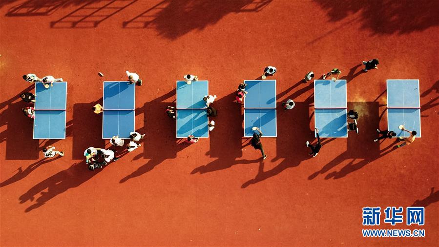 學生在安徽鳳陽小崗村小崗學校內打乒乓球(9月26日無人機拍攝)。 新華社記者 張端攝