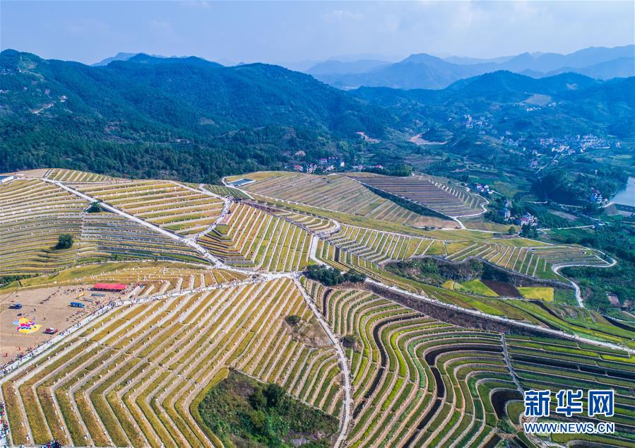 9月29日拍攝的秋日中的建德市大洋鎮(zhèn)高垣村梯田風景。當日,2000多名太極拳愛好者在浙江省建德市大洋鎮(zhèn)高垣村的千畝梯田上參加太極拳表演,吸引很多當?shù)厝撕陀慰颓皝碛^賞,助力當?shù)亟鹎飼r節(jié)鄉(xiāng)村旅游。近兩年來,大洋鎮(zhèn)充分利用土地整治后形成的千畝梯田打造農(nóng)業(yè)觀光綜合體,發(fā)展綜合型農(nóng)業(yè)觀光旅游,為鄉(xiāng)村振興注入新活力。新華社記者徐昱攝