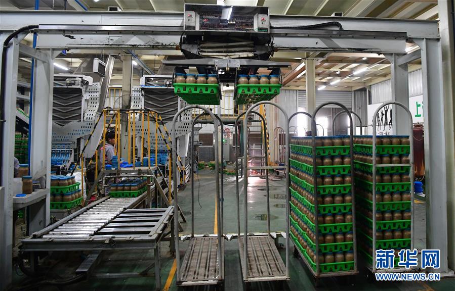 在位于清豐縣的河南龍豐實業(yè)股份有限公司,“機械手”在裝瓶車間自動轉(zhuǎn)運食用菌栽培瓶(9月28日攝)。新華社記者馮大鵬攝