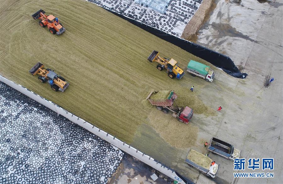 10月8日,工人駕駛機(jī)械設(shè)備在青貯飼料場作業(yè)(無人機(jī)拍攝)。 近年來,河北省故城縣結(jié)合市場需求,通過“龍頭企業(yè)+基地+農(nóng)戶”的經(jīng)營模式,鼓勵引導(dǎo)農(nóng)民發(fā)展訂單式青貯玉米種植,不僅增加了種植戶收入,而且為養(yǎng)殖企業(yè)提供了優(yōu)質(zhì)飼料。目前,故城縣已發(fā)展青貯玉米種植面積6萬余畝。 新華社記者 朱旭東 攝