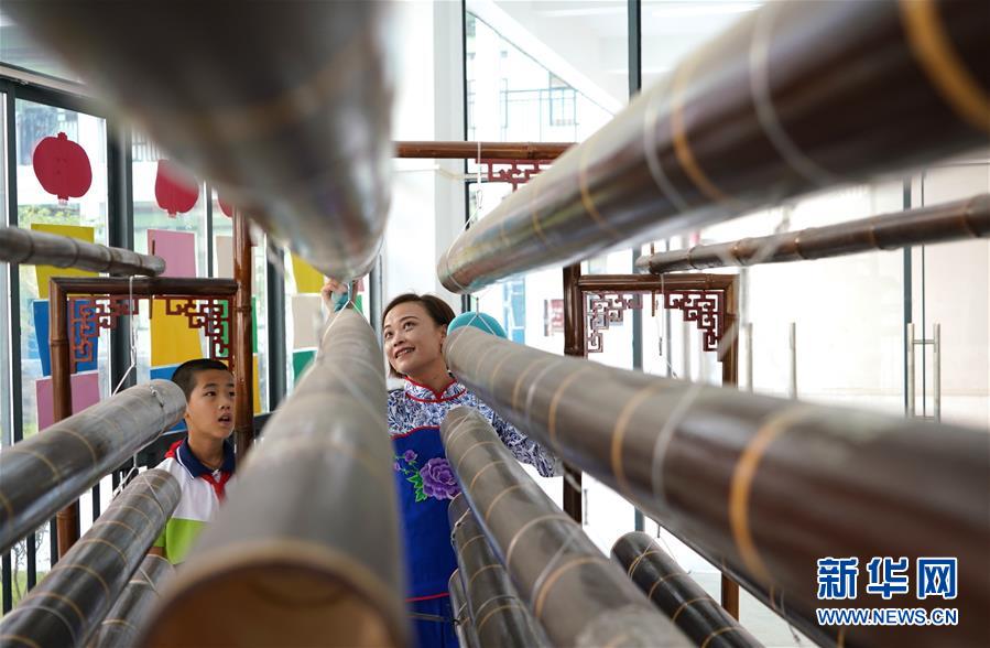 10月8日,崇義縣竹樂(lè)樂(lè)團(tuán)的演員在教學(xué)生演奏竹板琴。 近年來(lái),江西省崇義縣思源實(shí)驗(yàn)學(xué)校定期開(kāi)設(shè)竹樂(lè)課,邀請(qǐng)崇義縣竹樂(lè)樂(lè)團(tuán)的演員教授學(xué)生演奏竹排琴、竹板琴等竹樂(lè)樂(lè)器,激發(fā)學(xué)生了解傳統(tǒng)文化的熱情。 新華社記者胡晨歡攝