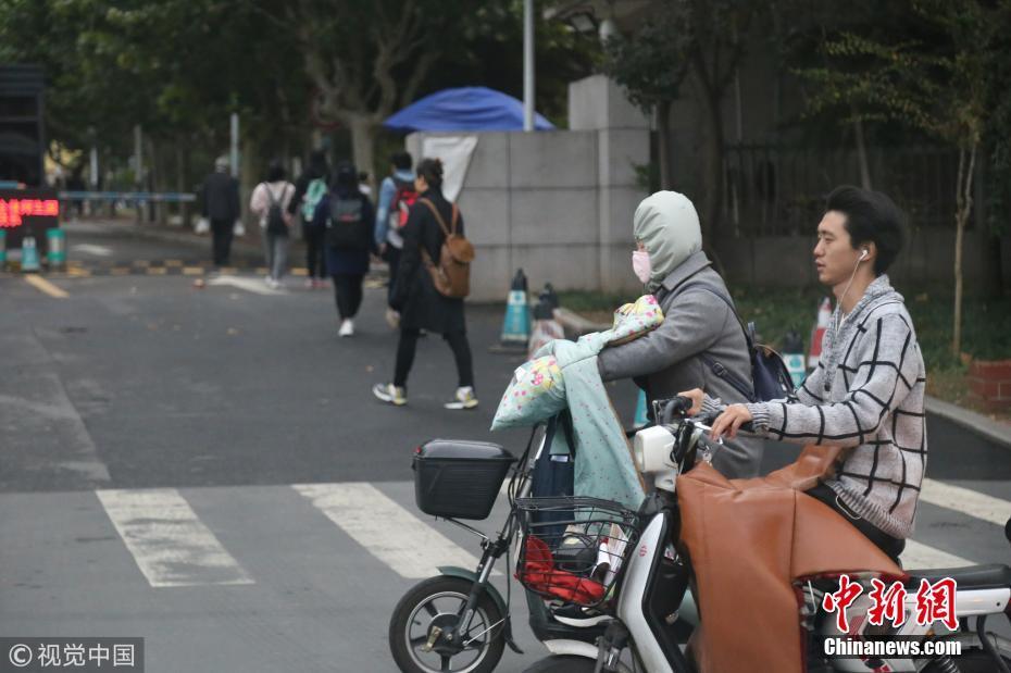 2018年10月9日,山東濟(jì)南,昨日一場(chǎng)秋雨過后開始降溫,今天清晨最低氣溫只有6度,馬路上不少上班族穿上羽絨服騎車趕上班路。 圖片來(lái)源:視覺中國(guó)