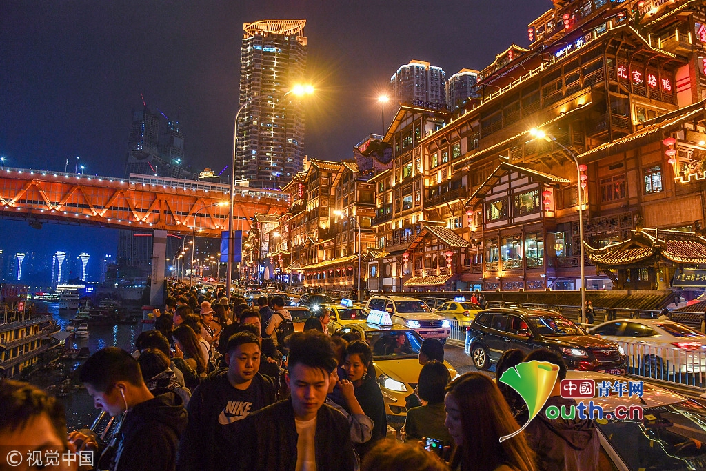 2018年10月8日,重慶,國(guó)慶長(zhǎng)假結(jié)束后,山城網(wǎng)紅景點(diǎn)洪崖洞依然處于暴擠狀態(tài),在抖音等短視頻平臺(tái)走紅以后,絢爛輝煌的洪崖洞夜景成為赴渝旅行第一打卡景點(diǎn)。