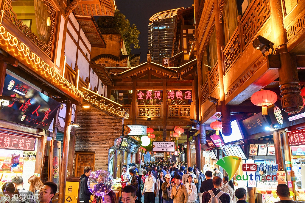 2018年10月8日,重慶,國慶長假結(jié)束后,山城網(wǎng)紅景點洪崖洞依然處于暴擠狀態(tài),在抖音等短視頻平臺走紅以后,絢爛輝煌的洪崖洞夜景成為赴渝旅行第一打卡景點。