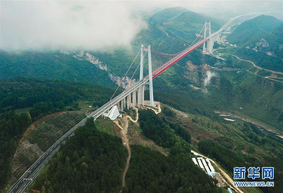 位于貴州、云南交界處杭瑞高速上的北盤(pán)江大橋(8月10日無(wú)人機(jī)拍攝)。其橋面至江面565.4米的垂直高度,被吉尼斯官方認(rèn)證為“世界最高橋”。新華社記者陶亮攝