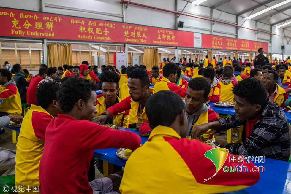 7月31日,埃塞俄比亞首都亞的斯亞貝巴的一家中國(guó)民營(yíng)制鞋工廠——華堅(jiān)鞋廠,下午的工作開始前,當(dāng)?shù)毓蛦T用中文喊著“一二三四”列隊(duì)集合,合唱廠歌。