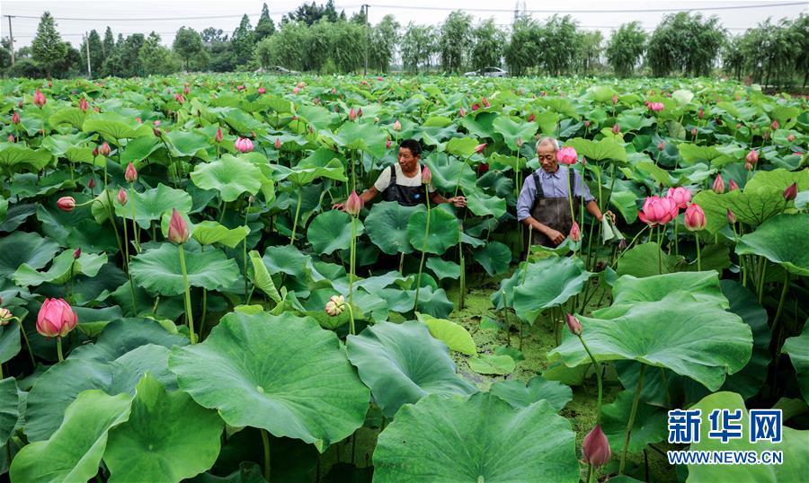 6月3日,荷農(nóng)們在荷花基地里挑選準(zhǔn)備出售的觀賞性荷花。新華社記者 徐昱 攝