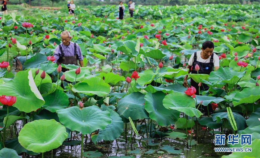 6月3日,荷農(nóng)們在荷花基地里挑選準(zhǔn)備出售的觀賞性荷花。新華社記者 徐昱 攝
