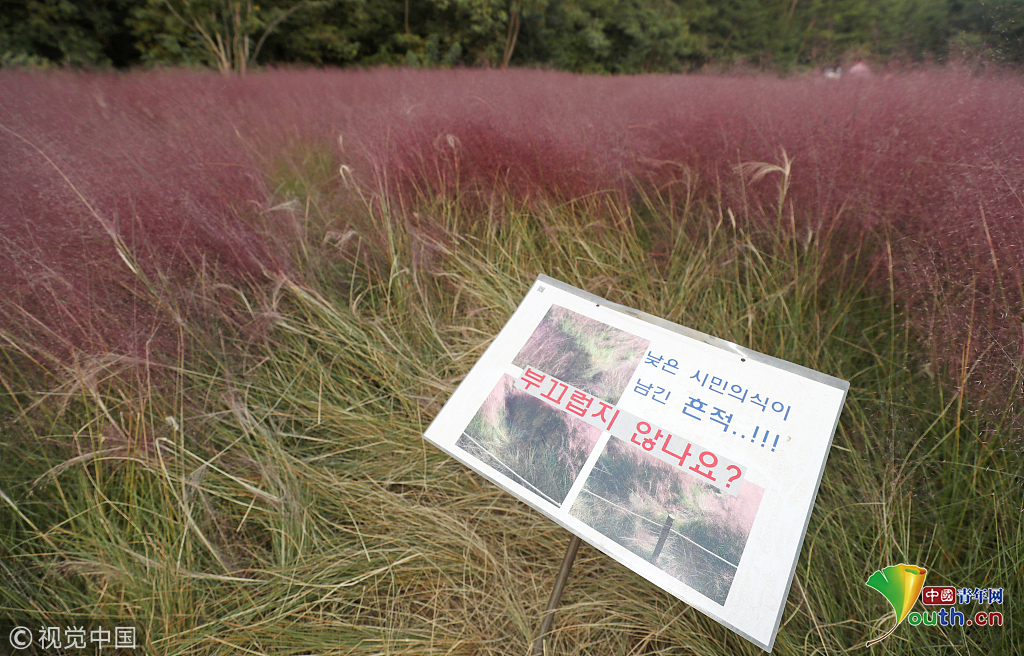 當(dāng)?shù)貢r(shí)間2018年10月16日,韓國蔚山,近日,蔚山公園大片粉黛亂子草盛開,粉紅花海浪漫十足,但部分花海遭游客隨意踩踏。圖片作者:Yonhap News Agency