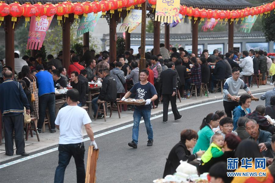 10月17日,村民與賓客在龍峰民族村參加“長桌宴”。 當日,在浙江省桐廬縣莪山畬族鄉(xiāng)龍峰民族村,一百桌宴席沿道路擺成一字長蛇陣,四方賓客和當?shù)卮迕褚黄鹌穱L著具有畬族特色的菜肴,場面頗為壯觀。 新華社記者 黃宗治 攝