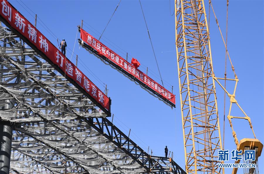 10月17日,工作人員在吊裝最后一組鋼梁。當日,京張高鐵新建車站——清河站主體結(jié)構(gòu)正式封頂。清河站是京張高鐵建筑面積最大的車站,同時也是京張高鐵在北京地區(qū)的始發(fā)站之一。 新華社記者 張晨霖 攝