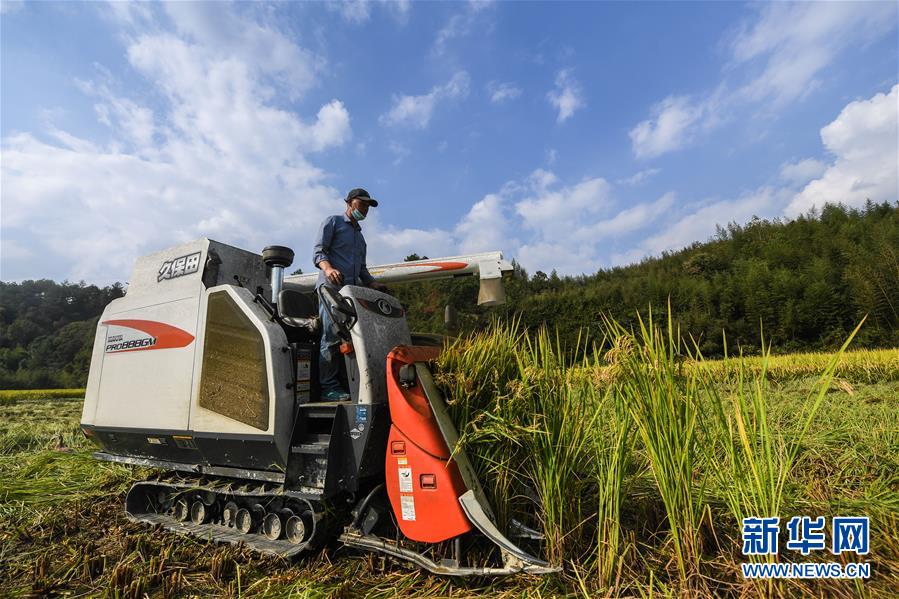 10月17日,工作人員操作收割機收割水稻。 新華社記者 徐昱 攝
