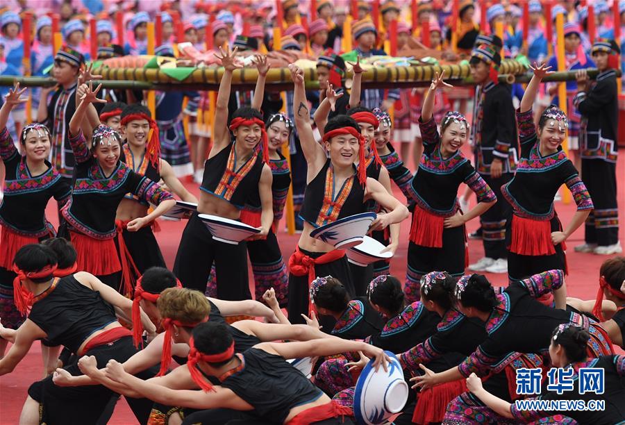 10月20日,各族同胞在廣西大化瑤族自治縣江濱文化廣場(chǎng)表演節(jié)目,慶祝縣慶。 新華社記者陸波岸攝