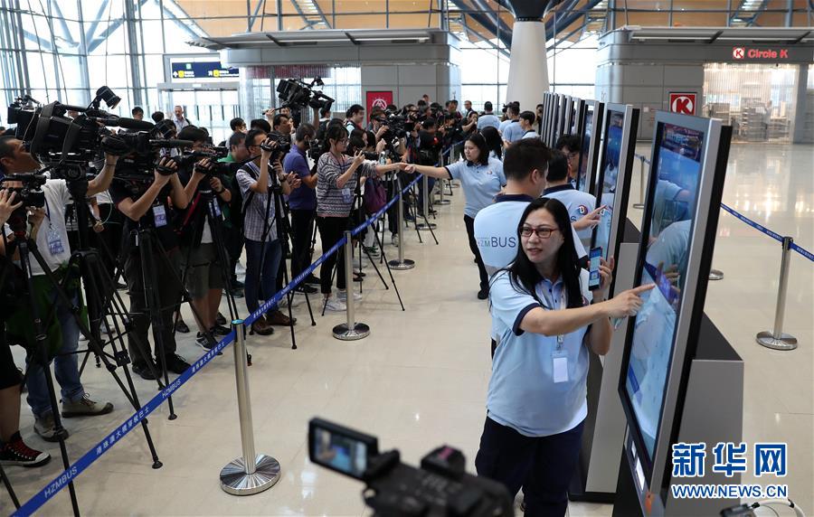 10月19日,在香港口岸旅檢大樓,工作人員在穿梭巴士自助售票機(jī)前演示購票過程。 港珠澳大橋開通在即。 新華社記者 李鋼 攝