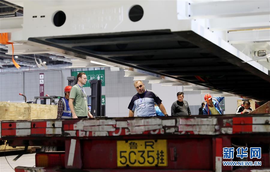 10月22日,德國工程師馬丁·霍爾茨海德(中)在吊裝過程中查看“金牛座”龍門銑床床身位置。 當(dāng)日,來自德國的首屆進(jìn)口博覽會最大展品——“金牛座”龍門銑床完成初步組裝,將運(yùn)往國家會展中心(上海)3號館進(jìn)行最后的安裝施工。這是德國瓦德里??票す狙邪l(fā)的機(jī)床設(shè)備,高約8米,占地面積約200平方米,將在智能及高端裝備區(qū)進(jìn)行展出。 新華社記者方喆攝