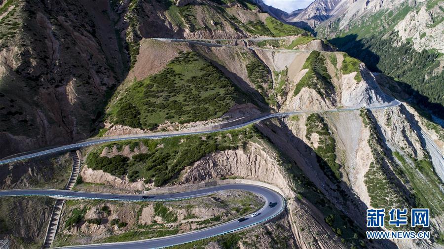 連續(xù)轉彎的獨庫公路盤山道(2017年7月15日無人機拍攝)。 新華社記者 江文耀 攝